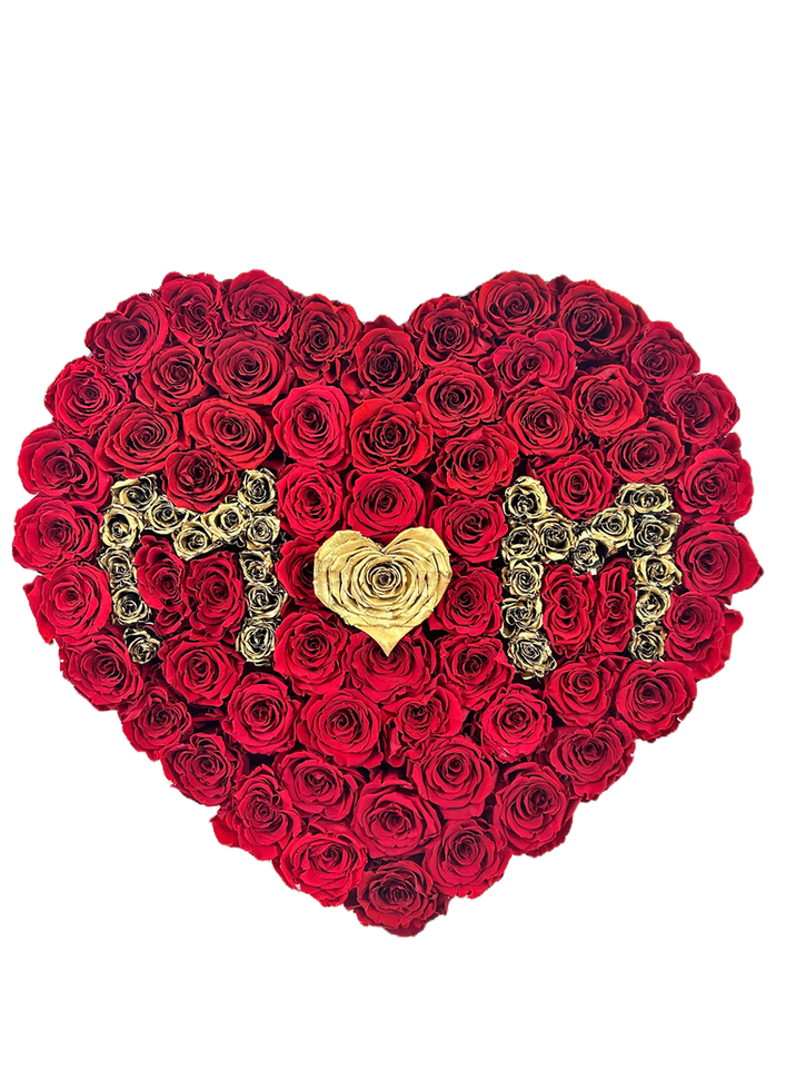 Celebrate Mother’s Day with the most luxurious floral gift. This heart-shaped box is filled with real preserved roses in classic red and metallic gold, spelling out “M❤️M” in the most elegant way.